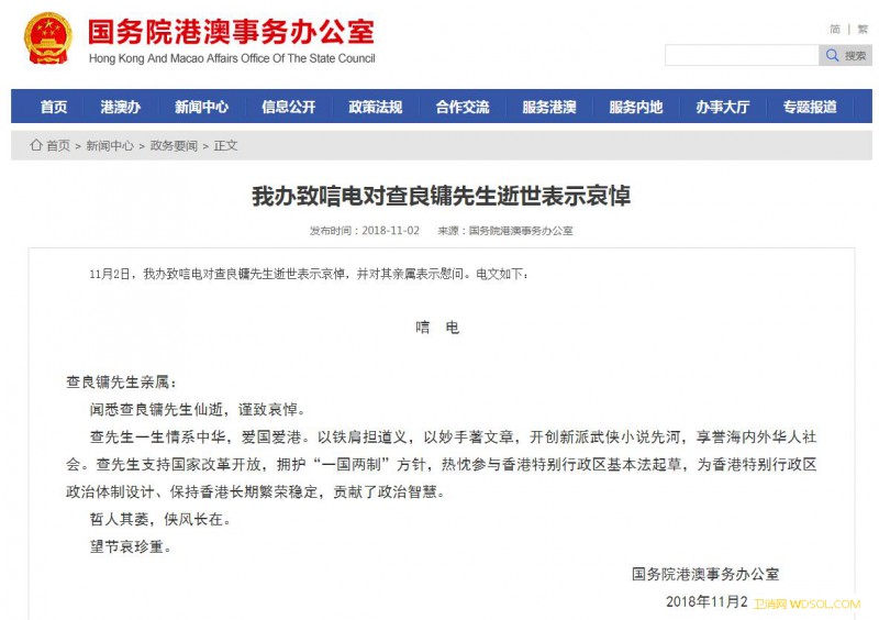 国务院港澳办致唁电对查良镛先生逝世表_香港特别行政区-唁电-国务院-