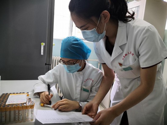 丰台区东高地社区卫生服务中心下沉干部,党员柏丹丹(右)和同事在做新冠抗体检测前准备工作。