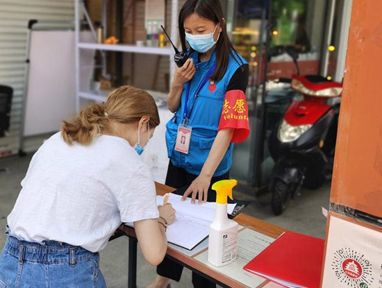 7月1日,太平桥街道丽湾社区书记杨霞在卡口执勤检查登记出入人员健康码。