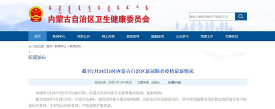 人民网呼和浩特7月24日电 (陈立庚)据内蒙古自治区卫生健康委员会7月24日发布的消息,2020年7月23日7时至7月24日7时,内蒙古自治区报告无新增确诊病例、疑似病例。