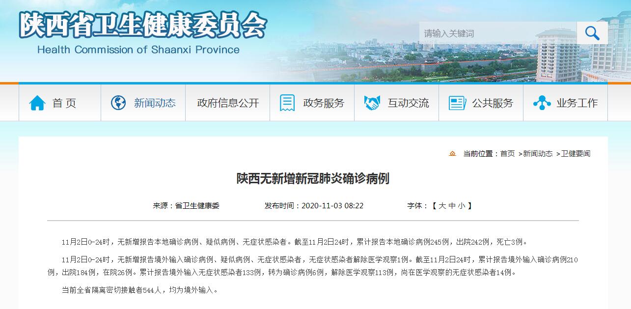 人民网西安11月3日电 据陕西省卫健委消息,11月2日0-24时,无新增报告本地确诊病例、疑似病例、无症状感染者。截至11月2日24时,累计报告本地确诊病例245例,出院242例,死亡3例。