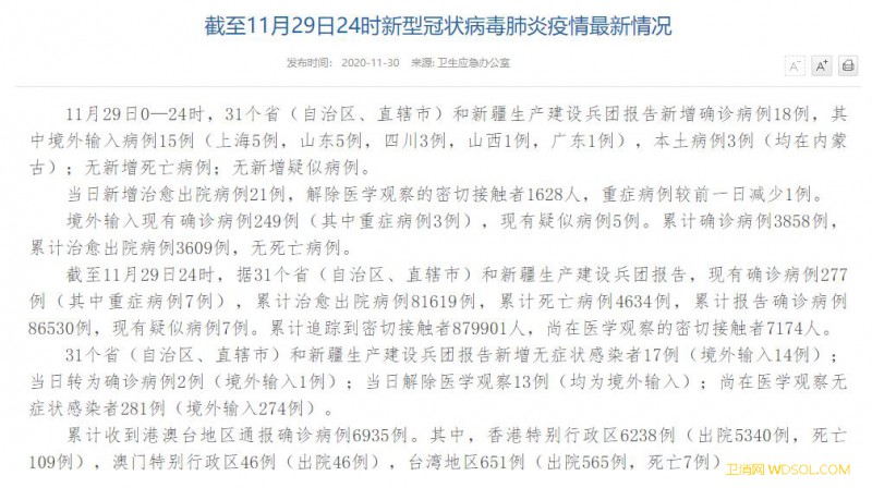 国家卫健委:11月29日新增确诊病例18例其_病例-出院-累计-蒙古
