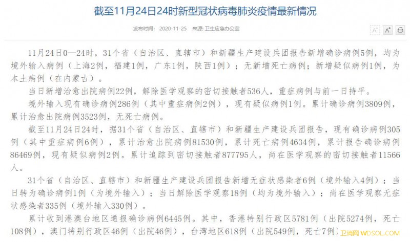 国家卫健委:11月24日新增确诊病例5例均为_病例-出院-境外-累计