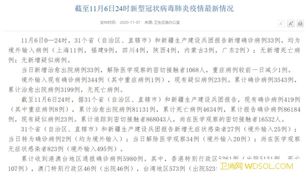 国家卫健委:11月6日新增确诊病例33例均为_病例-出院-境外-累计