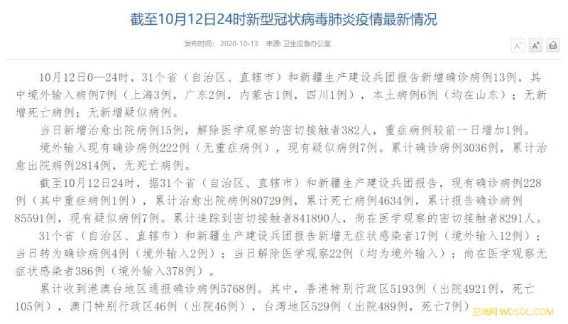 国家卫健委:10月12日新增确诊病例13例其_病例-出院-境外-累计